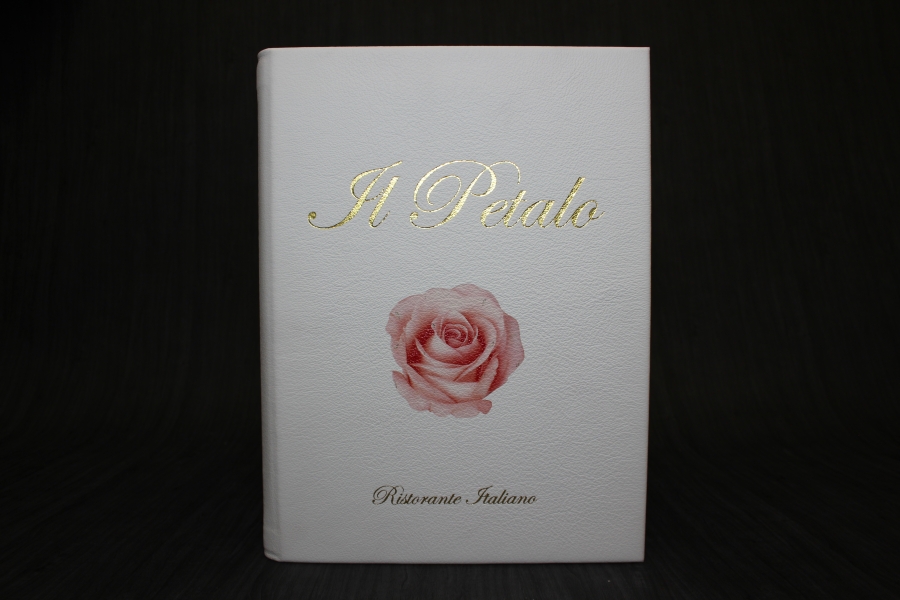 Why not be different? full white leather menu cover with a hot foil gold and full colour digital print.